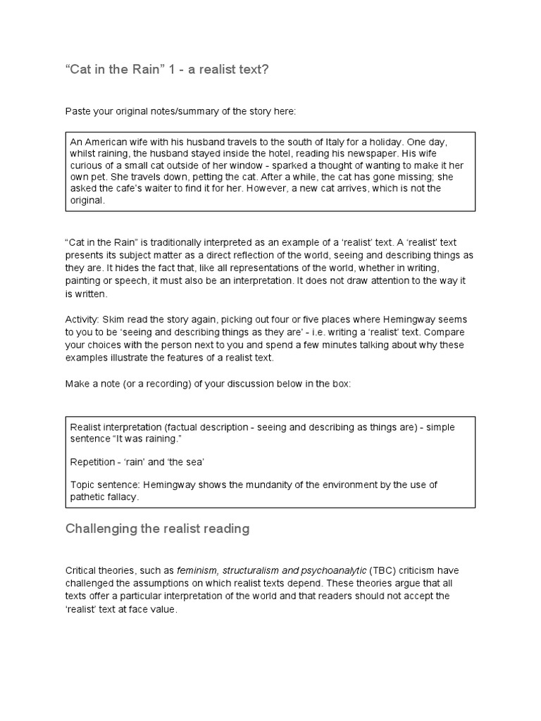 It is a rainy day and the american woman sees a cat in the rain, which she wants to protect from the raindrops. It must have been a miserable spectacle: From the creators of sparknotes. Many italians come from distant. The cat sat under the table and tried to make herself so compact that she wouldn't be dripped on.